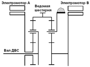 Следует отметить, что данная схема полностью удовлетворяет всем требованиям, которые предъявляются гибридным трансмиссиям. Начало движения можно осуществлять, как с использованием только мощности аккумуляторной батареи, так и с использованием только мощности ДВС.