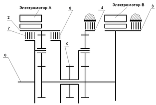 Механическая часть трансмиссии состоит из двух планетарных рядов и не содержит ни одного фрикционного элемента управления. Электрическая часть включает в себя две электромашины.