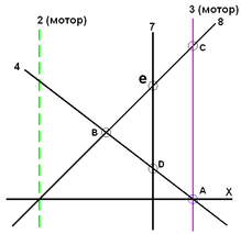 В случае разгона только с помощью ДВС должен быть включен тормоз звена 4. Частота электромотора B изменяется от нулевого значения (на плане угловых скоростей точка А) до максимального (точка В). Частота вращения электромотора А уменьшается от максимального значения (точка А) до минимального (точка В).