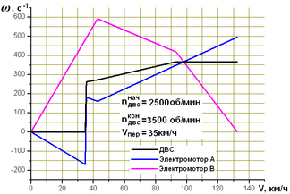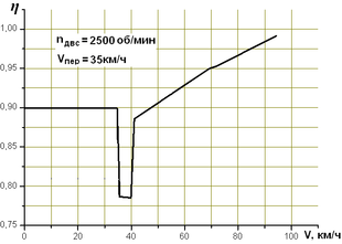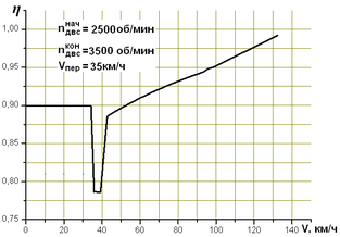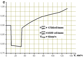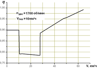 Как видно из графика на режиме EVT1 (15 км/ч < V < 26 км/ч) движение происходит с достаточным низким КПД трансмиссии. Затем при переходе на режим EVT2 (V > 26 км/ч) КПД трансмиссии резко возрастает и в дальнейшем с увеличением скорости также возрастает.