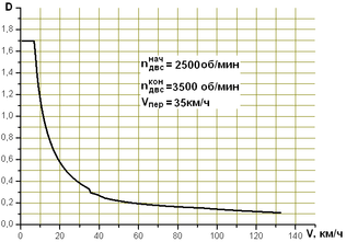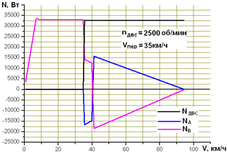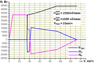 Графики изменения мощности, развиваемой ДВС Nдвс и передаваемой электрической часть трансмиссии мощности NA и NB, представлены на рис.114. На рис.115 показана зависимость динамического фактора D от скорости движения транспортного средства.