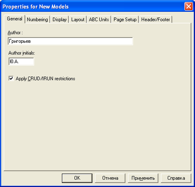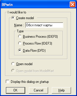 1. Запустите пакет BPwin. Выберите пункт меню File/New. В появившемся окне (Рисунок 1.4) заполните поле Name и выберите тип Data Flow (DFD).