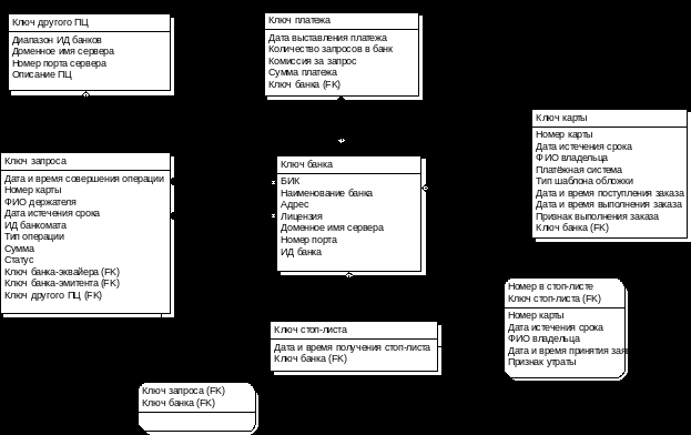 На рмс. 1 схема БД представлена на уровне сущностей. "Банк" описывает банки платёжной системы, подключённые к процессинговому центру. "Запрос" описывает запросы от банкомата. "Другой_процессинговый_центр" определяет другие процессинговые центры, подключённые к данному. "Платёж_за_процессинг" - платежи, выставленные банкам за услуги, предоставленные процессинговым центром. "Карта_для_эмиссии" - данные, переданные процессинговому центру банком-эмитентом для эмиссии пластиковых карт (если банк делегировал эту функцию процессинговому центру). "Стоп-лист" - стоп-листы, переданные банками в процессинговый центр. "Стоп-карта" - данные о заблокированной карте, которая входит в стоп-лист. «Запрос_Банк» - вспомогательная сущность, реализующая связь М:М между сущностями «Запрос» и «Банк».