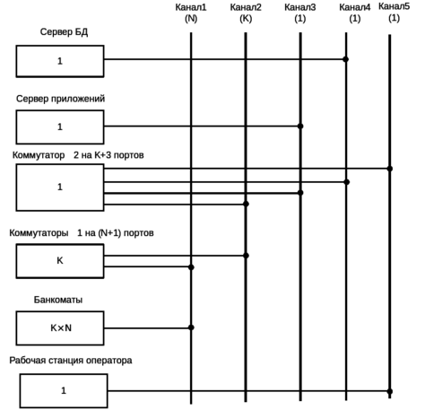 узел «Коммутатор2» содержит одну станцию (это стек коммутаторов на K=100 портов для подключения станций узла «Коммутаторы1» и 3 порта для подключения станций узлов «Сервер приложений», «Сервер БД», «Рабочая станция оператора», т.е.K+3=103 порта),