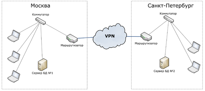 к серверу БД №1: найти клиентов, у которых остаток на счёте не меньшее 1000, и которые имеют счёт в Санкт-Петербурге. Запрос выполняется на сервере БД №1 и результат возвращается на сервер БД №2;