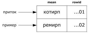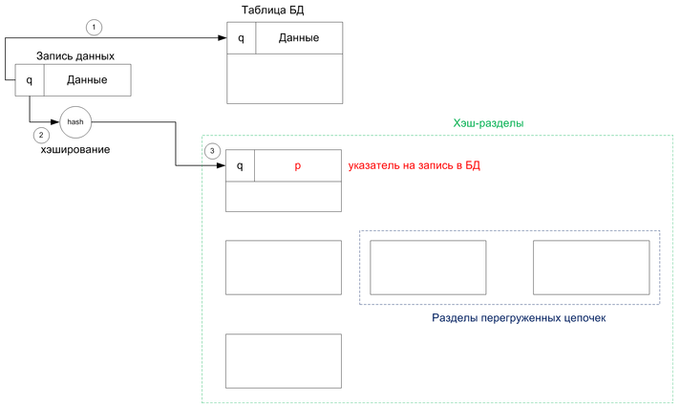 Доступ к записи можно описать с помощью следующей цепочки: q→h(q)=i→ чтение i раздела хэш-индекса →(q,p)→ чтение по p записи из таблицы БД.