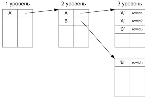 Структура битового индекса такая же, как и у B-дерева. Отличаются они структурой записи блока листового уровня.