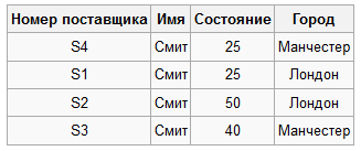 Пример: выдать номера поставщиков, города проживания и состояния поставщиков с именем Смит в алфавитном порядке городов и в порядке убывания состояния.