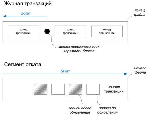 В журнале транзакции сохраняются полные транзакции (записываются записи после обновления). В этом же журнале записываются метки по перезаписи всех "грязных" блоков.