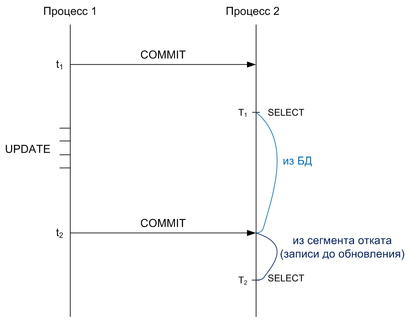 Предположим, что в момент T1 выполняется SELECT и проверяется время обновления записи. Если T1>t1, то запись читается из БД. Если T1<t1=tобновления, то записи читаются из сегмента отката (до обновления). Представленный механизм ведения версии записей обеспечивает целостность чтения данных в интервале T1−T2.
