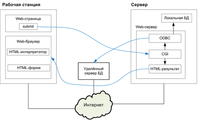 Браузер отображает страницу, пользователь заполняет поля формы и жмёт submit, который связан с определённой CGI-программой. Программы выполняется на сервере, обращаясь к ODBC, который обращается к БД. Результаты выполнения запросов возвращаются к CGI-программе, которая генерирует новый HTML и отдаёт его на рабочую станцию пользователю в веб-браузер.
