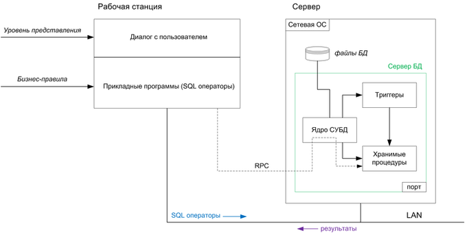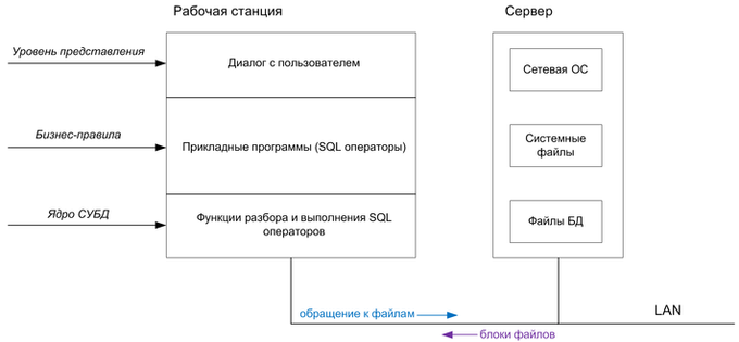 часто перегружают каналы связи, так как передаются не только записи таблиц БД, но и промежуточные (индексы, данные сортировки). Файловый сервер выступает в качестве удалённого разделяемого диска;