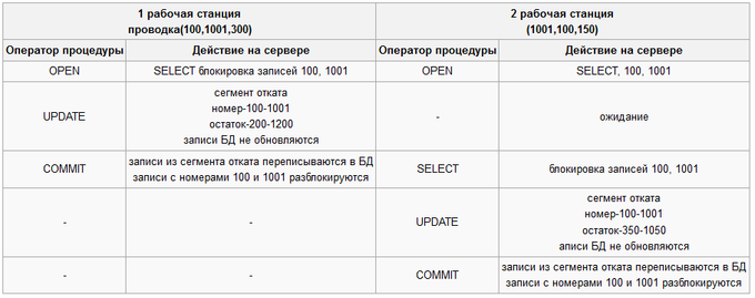 При открытии курсора вторым процессом система найдёт (опять выполнится SELECT) записи 100 и 1001, но процесс перейдёт в состояние ожидания, так как записи уже заблокированы.