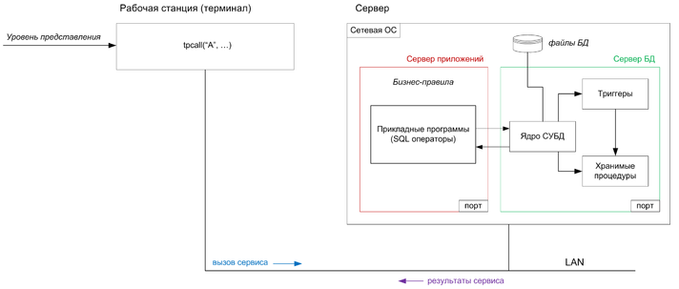 Пользователь жмёт кнопку, на сервере приложений запускается соответствующий сервис (например, A). Если есть SQL оператор, то он передаётся на сервер БД. Там он разбирается и выполняется. При этом доступ к файлам БД осуществляется через внутреннюю шину сервера. Результаты сервиса возвращаются в рабочую станцию и там отображаются на экране.