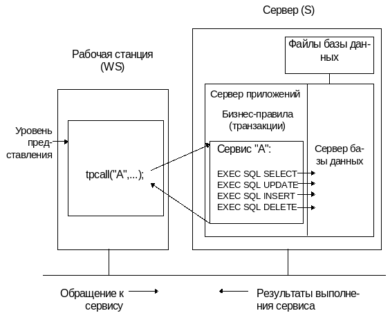 В настоящее время наиболее популярен менеджер транзакций Tuxedo (BEA System). Он представляет собой оболочку, в рамках которой выполняются сервисы (прикладные программы), написанные на языке С. Tuxedo выполняет маршрутизацию запросов к сервисам, организует динамическое распределение нагрузки и мультиплексирование запросов к базам данных. Часто менеджер транзакций и приложения запускаются на том же компьютере (хотя это не является обязательным), где выполняется сервер базы данных, чтобы уменьшить поток SQL-запросов по сети.
