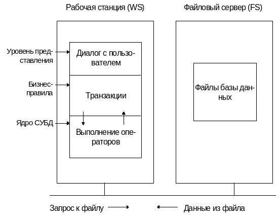 Здесь приложения выполняются на рабочих станциях. Приложение включает модули для организации диалога с пользователем, бизнес-правила (транзакции), обеспечивающие требуемую логику вычислений, и ядро СУБД. Часто ядро СУБД в модели файлового сервера не является выраженным и представляет собой набор функций, связанных с остальными компонентами приложения. Приложение, включая и ядро СУБД, дублируется на различных рабочих станциях. На файловом сервере хранятся только файлы базы данных (индексы, файлы данных и т. д.) и некоторые технологические файлы (оверлейные файлы, файлы сортировки и др.). Операторы обращения к СУБД, закодированные в прикладной программе, обрабатываются ядром СУБД на рабочей станции. СУБД организует доступ к файлам базы данных для выполнения оператора. По сети передаются запросы на чтение/запись данных, индексы, промежуточные и результирующие данные, блоки технологических файлов.