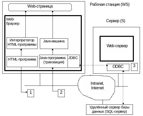 3 - в процессе выполнения Java-программы на рабочей станции она может через интерфейс JDBC (Java Data Base Connectivity) обращаться к удалённому серверу базы данных. Для этой цели JDBC использует соответствующий ODBC-драйвер на Web-сервере, откуда была загружена Java-программа.