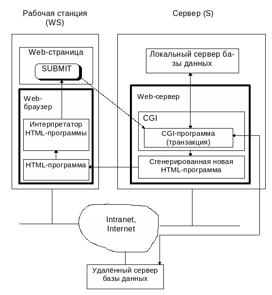 Сначала по запросу Web-браузера из Web-сервера Internet читается HTML-форма (это HTML-программа, которая содержит описание полей ввода для Web-страницы и имя CGI-программы для их обработки). Web-браузер интерпретирует эту программу и выводит страницу на экран рабочей станции. Пользователь должен заполнить поля ввода и нажать кнопку типа SUBMIT. Web-браузер пересылает Web-серверу имя CGI-программы обработки, имена полей ввода и их значения. Web-сервер в свою очередь, используя интерфейс CGI (Common Gateway Interface), запускает CGI-программу (транзакцию), которая с помощью SELECT-запроса через ODBC-интерфейс читает данные из локальной или удалённой базы данных и с помощью оператора print генерирует новую HTML-программу, содержащую результаты поиска. Эта программа передаётся на рабочую станцию, где и интерпретируется Web-браузером. Пользователь видит Web-страницу с данными, полученными из базы данных.