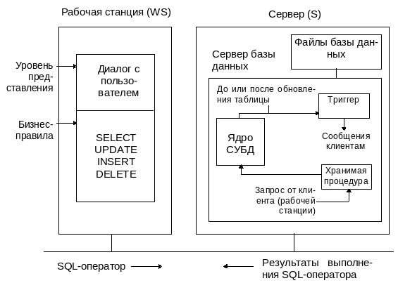 В современных СУБД на сервере могут запускаться так называемые хранимые процедуры и триггеры, которые вместе с ядром СУБД образуют сервер базы данных. К хранимым процедурам можно обращаться из приложений на рабочих станциях. Это позволяет сократить размер кода прикладной программы и уменьшить поток SQL-операторов с рабочей станции, так как группу требуемых SQL-предложений можно закодировать в хранимой процедуре. Триггеры - это программы, которые выполняются ядром СУБД перед или после обновления (UPDATE, INSERT, DELETE) таблицы базы данных. Они позволяют автоматически поддерживать целостность базы данных.