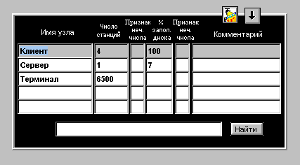 На рис. 4.5 в качестве примера приведена таблица, используемая для описания узлов РСОД. Чтобы выполнить поиск в этой таблице, необходимо в поле ввода (оно обычно располагается внизу таблицы) ввести условие поиска и щёлкнуть кнопку Найти.