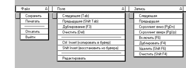 Дублировать(F4). Копирует поля предыдущей строки в текущую новую запись. Как правило, используется после команды Включить в случае, если эти строки имеют много общих полей. "Горячая" клавиша - F4.