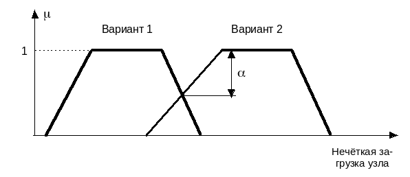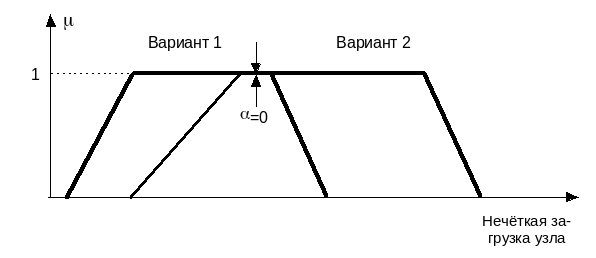В этом случае два варианта нельзя сравнить по нечёткой загрузке узла (степень доверия =0). Это свидетельствует о недопустимо большой неопределённости исходных данных, используемых для расчётов. Единственный выход в данной ситуации - это уменьшить неопределённость, то есть сократить интервалы (R1, R4) нечётких чисел, заданных для входных параметров.