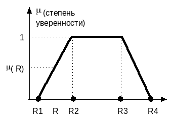 Проектирование распределённых систем обработки данных, как правило, выполняется в условиях большой неопределённости исходных данных. В рассматриваемой системе описание параметров РСОД и расчёты характеристик могут выполняться с использованием нечётких чисел. В КИСП используется трапециевидная форма представления нечёткого числа (рис. 4.6), которая характеризуется четырьмя числами (R1, R2, R3, R4). Степень уверенности в теории нечётких множеств называют степенью принадлежности.