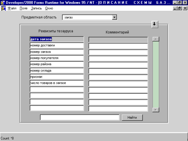 Выделите в блоке Предметная область конкретную подсистему и в блоке Тезаурус введите наименования реквизитов выбранной подсистемы, которые затем будут использоваться для описания таблиц базы данных.