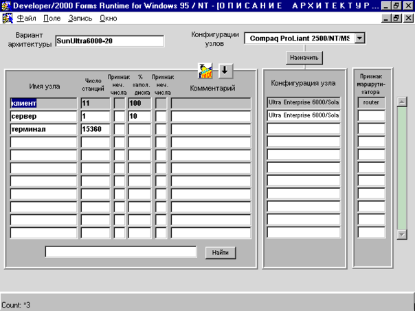 Здесь можно для текущего варианта архитектуры включить, удалить, изменить наименование узла проектируемой РСОД, а также ввести