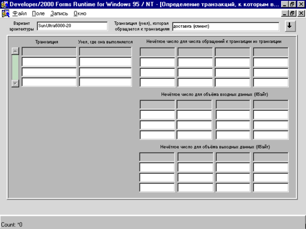 Для задания нечёткого числа повторных обращений к вызываемым транзакциям необходимо в требуемых строках заполнить все четыре поля (R1, R2, R3, R4) мультистолбца Нечёткое число для числа обращений к транзакции из транзакции. Для определения нечёткого объёма входных данных следует в требуемых строках заполнить все четыре поля мультистолбца Нечёткое число для объёма входных данных (Кбайт) (строки этого мультистолбца являются продолжением соответствующих строк столбцов, расположенных выше). Для задания нечёткого объёма выходных данных необходимо в требуемых строках заполнить все четыре поля мультистолбца Нечёткое число для объёма выходных данных (Кбайт) (строки этого мультистолбца являются продолжением соответствующих строк столбцов, расположенных выше).