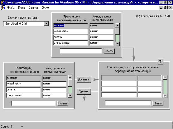 Выберите в списке Варианты архитектуры требуемый вариант. В блоках Транзакции, выполняемые в узле (вверху) и Транзакции, выполняемые в узле (внизу) появятся наименования выполняемых в узлах транзакций выбранного варианта архитектуры.
