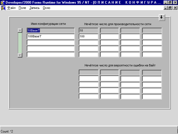 Рис. 13.2. Окно для определения производительности сети и вероятность ошибки на байт в виде нечётких чисел.