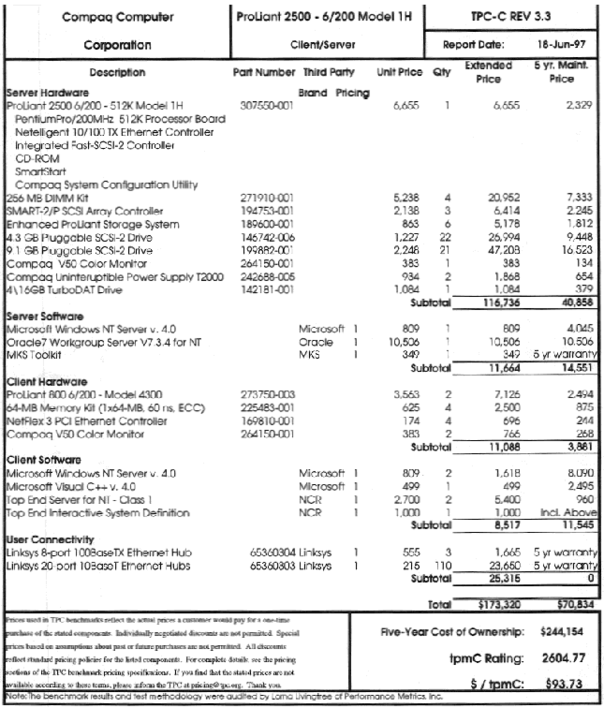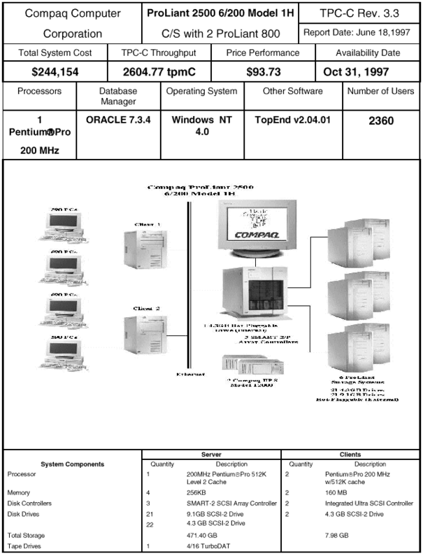 | Compaq ProLiant 2500 6/200 Model 1/H (1) | Windows NT Server v.4.0 | Oracle 7 Workgroup Server v 7.3.4 for NT | 200 MHz Pentium Pro (1) | 256 Mb DIMM Kit (4) | 3хSMART-2/P SCSI Array Controller | 43 | 281.3 | 18.4 |