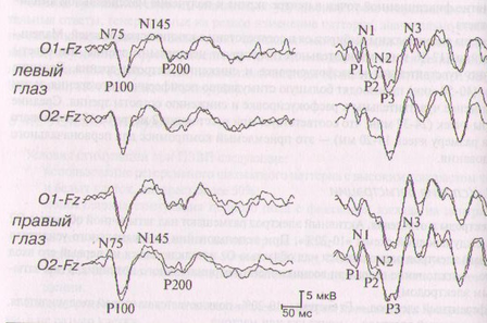Пример ЗВП на реверсивный шахматный паттерн у здорового испытуемого с остротой зрения 1 показан на рис. 4. Здесь же представлены обозначения основных компонентов ответа: N75. Р100, N145, Р200 и проведено сопоставление с ответом на вспышку (ответы показаны справа).