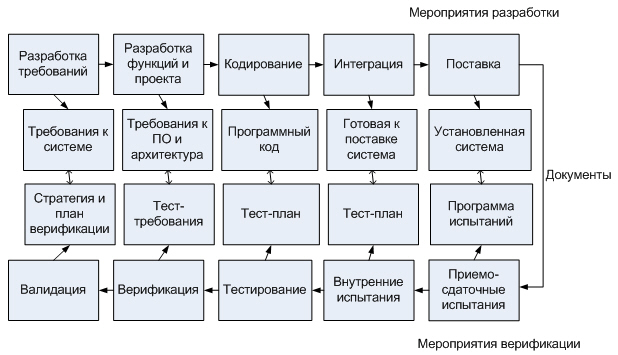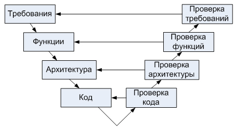В качестве своеобразной "работы над ошибками" классической каскадной модели стала применяться модель жизненного цикла, содержащая процессы двух видов - основные процессы разработки, аналогичные процессам каскадной модели, и процессы верификации, представляющие собой цепь обратной связи по отношению к основным процессам (Рис. 1.2).