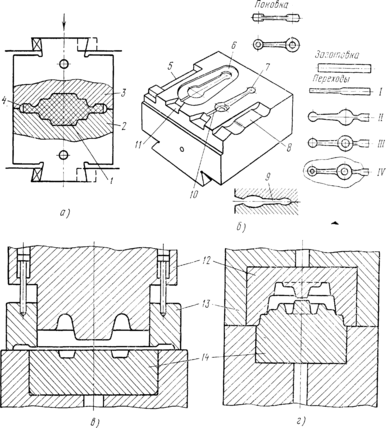 а — одноручьевой молотовый штамп, б — многоручьевой молотовый штамп, в — штамп с закрытым магазином, г — штамп для безоблойной штамповки; 1 — заготовка, 2 — нижняя половина штампа, 3 — верхняя половина штампа, 4 — облойная канавка, 5 — перетяжной ручей, 6, 7 — штамповочные ручьи, 8 — подкатной ручей, 9, 10 — облойные канавки, 11 — клещевина, 12 — верхняя формообразующая вставка, 13 — кольцо, 14 -— нижняя формообразующая вставка