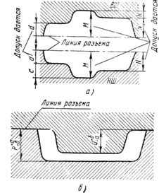 если поверхность ручья выступает от линии разъема, то допуски применяют с размеры обратным знаком, как показано на рис. 9., штампы должны быть прошлифованы по плоскости разъема и плоскости контрольного угла;