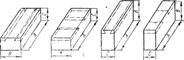 Кованые заготовки для верхней и нижней частей штампа называют кубиками. Согласно ГОСТ 7831—71 размеры кубиков стандартизованы. Самый маленький кубик имеет размеры (ширина Х высота Х длина) 200Х X 140Х300 мм, а самый большой 375х350х950 мм. Кубики, имеющие сечение меньшее или большее, чем указано, не стандартизованы и могут иметь любые размеры, в соответствии с конкретными условиями. На рис. 10 показано обозначение размеров штамповых кубиков в плоскости разъема штампа и размещение хвостовиков с учетом направления волокон в заготовке.