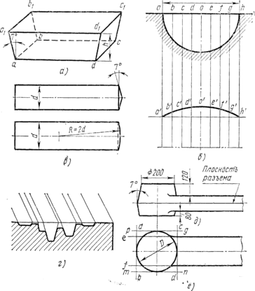 промежуточных точках b, с, d и т. д.— некоторые промежуточные значения. Поэтому линия, соединяющая точки отклонения на штамповочный уклон а', b', с', d', о', и т. д., будет не прямой, а кривой (дугой эллипса), которую и нужно размечать на торце цилиндра. В заводских условиях такую кривую не строят, а размечают торец цилиндра упрощенным способом, проводя на торце прямые линии под углом 7° или описывая дугу круга радиусом, равным двум диаметром (рис. 11, в).