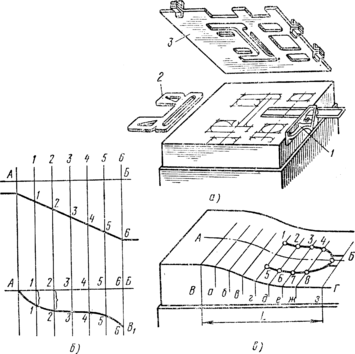 Таким образом, разметка сводится к вычерчиванию на лицевой стороне штампа контура той фигуры, которая получается при разрезе штампуемой детали плоскостью разъема штампа. Кроме контура ручья с учетом штамповочного уклона, на плоскость разъема наносят линии пересечения всех вертикальных и наклонных поверхностей полости с плоскостью разъема, даже если эти поверхности не доходят до плоскости разъема (рис. 11,а).