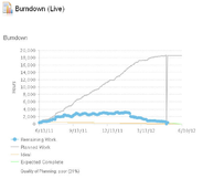 Пунктирная голубая линия обозначает объем работы, или оставшуюся работу в часах. Тонкая серая линия обозначает запланированную работу или сумму оставшейся работы и выполненной. Эталонная линия показывает, как должна выглядеть идеальная итерация с равномерным распределением работы от начала до конца итерации. В качестве начальной точки эталонной линии используется начальная точка данных для запланированной работы. Линия "Ожидаемое завершение" - это план-прогноз, построенный от текущего состояния линии объема работ до конца дорожки. Эта линия указывает требуемую скорость работы для успешного завершения итерации.