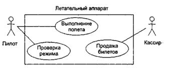 Например, для коммерческого летательного аппарата можно выделить двух актеров: пилота и кассира. Сидоров — пользователь, который иногда действует как пилот, а иногда — как кассир. Как изображено на рис. 12.27, в зависимости от роли Сидоров взаимодействует с разными элементами Use Case.