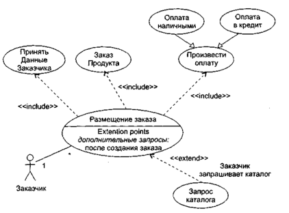 Как показано на рис. 12.34, внутри элемента Use Case может быть дополнительная секция с заголовком Extention points. В этой области перечисляются точки расширения. В указанную здесь точку дополнительные запросы вставляется последовательность действий от расширяющего элемента Use Case Запрос каталога. Для справки отмечено, что точка расширения размещена после действий, обеспечивающих создание заказа. На этом же рисунке отображены отношения наследования между элементами Use Case. Видно, что элементы Use Case Оплата наличными и Оплата в кредит наследуют поведение элемента Use Case Произвести оплату и являются его специализациями.