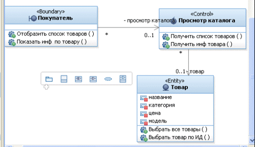 Связать классы направленной ассоциацией: от граничного к управляющему, от управляющего к сущностям: