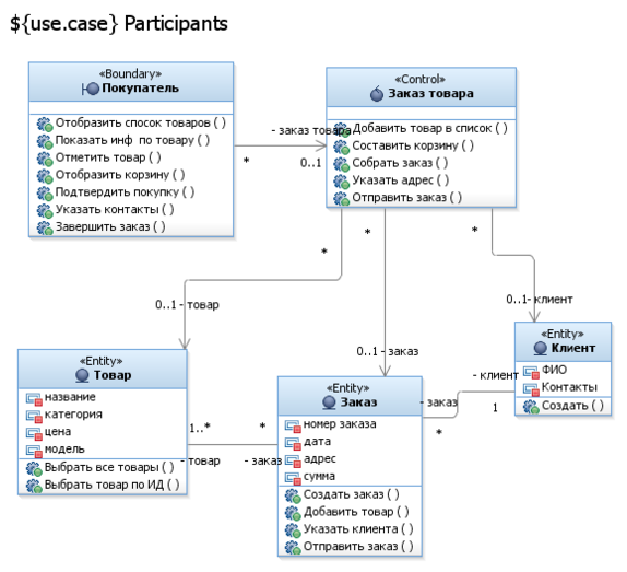 Добавить на диаграмму классов участников те классы анализа (созданные ранее), которые участвуют в этой кооперации и соединить их ассоциациями (от граничного к управляющему, от управляющего к сущностям).