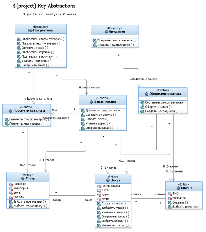 Определить ассоциации между классами в соответствии с их взаимодействием для реализации прецедента (общая схема: граничный — управляющий — сущности).