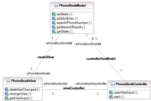 Нарисуйте линию отношения сопоставления от класса PhoneBookController к PhoneBookModel (порядок имеет значение) для создания отношения направленного сопоставления между этими двумя классами. Отношение направленного сопоставления означает, что первый класс знает о втором, но не наоборот;