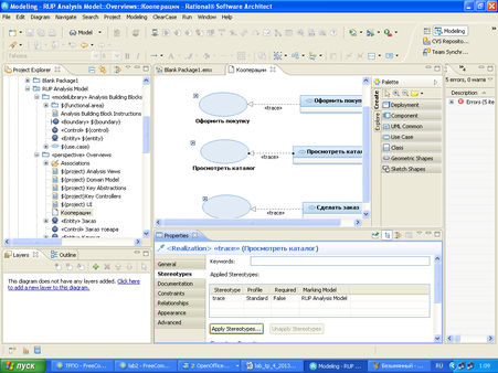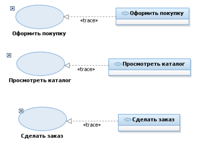 Соединить прецеденты и кооперации (их реализующие) связью Реализация. Выделить связи и установить для них (на панели Свойства, вкладка Стереотипы) стереотип TRACE (кнопка Apply Stereotype):