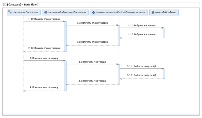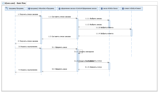 Поток событий реализует алгоритм прецедента. Обычно используются синхронные сообщения и вложенность действий (вызовов).