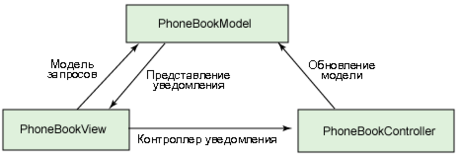 Класс PhoneBookModel управляет записями телефонной книги и регистрирует состояние приложения. При изменении состояния уведомляется класс PhoneBookView, который затем на основании состояния приложения обновляет пользовательский интерфейс;